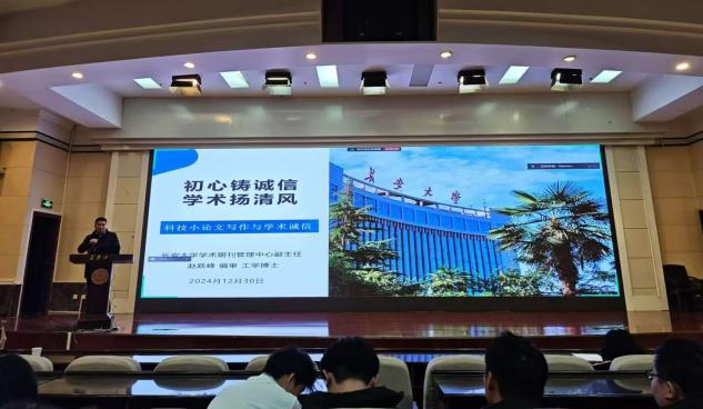 为加强研究生学术道德教育,营造风清气正的学术氛围,12月30日晚,永利集团88304官网在北院学术交流中心报告厅通过线上线下相结合的方式开展了初心铸诚信,学术扬清风——学术诚信与论文写作专题讲座,此次讲座由永利集团88304官网学术期刊管理中心副主任赵跃峰编审主讲,学院党委副书记屈颖主持,学院研究生导师、研究生辅导员及全体研究生、部分本科生参加此次讲座。